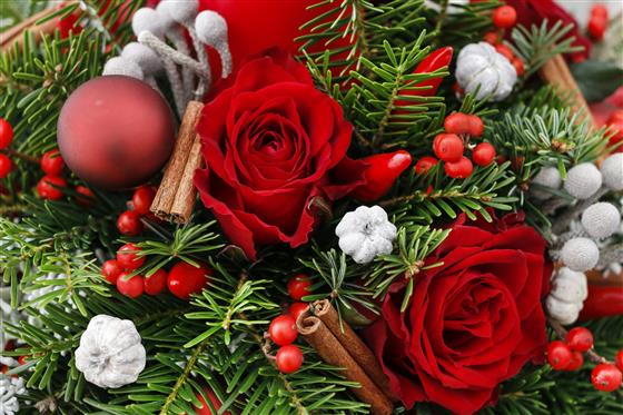 This festive 'Florist Choice' hand-tied arrangement will be filled with the season's finest blooms and berries, all chosen for their striking shades of deep red.