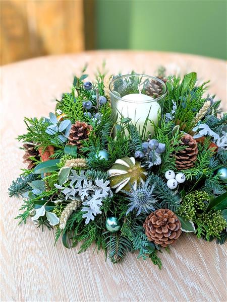 Bring the tranquil beauty of a snowy landscape to your table with The Winter Wonderland Centrepiece. This elegant table decoration features a luxurious mix of natural evergreens, including aromatic pine, cypress, and soft eucalyptus. The design is finished with beautifully contrasting elements like frosted Dusty Miller (Cineraria) foliage, icy blue sea thistle (Eryngium), natural pine cones, dried limes and delicate sage and white accents.