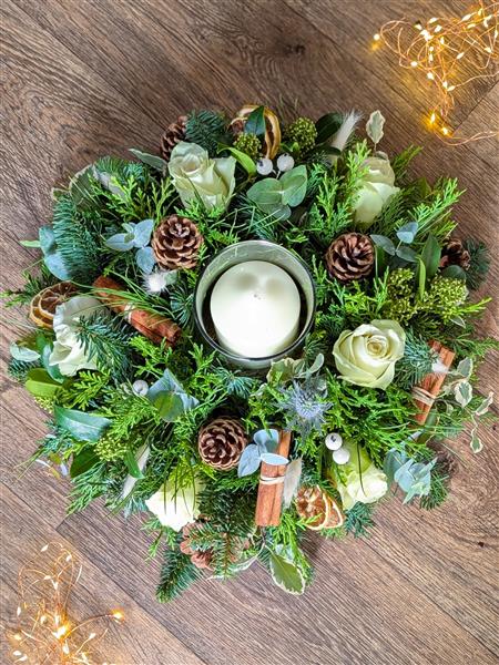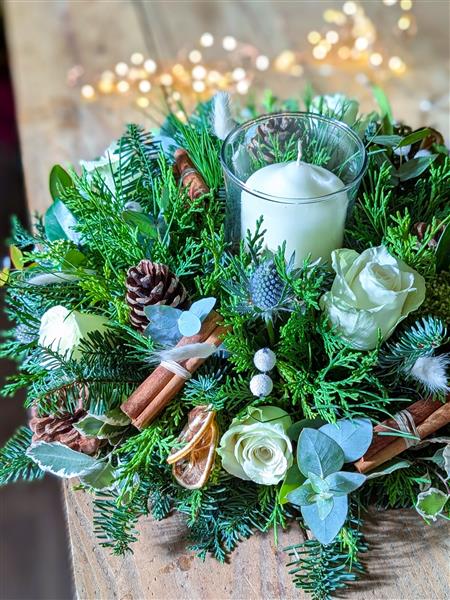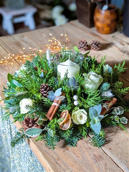 Bring the timeless elegance of a snowy Christmas morning to your home with The White Christmas Centrepiece. This sophisticated design focuses on fresh, crisp tones, featuring luxurious white roses nestled amongst a rich variety of fragrant evergreen foliage. The arrangement is beautifully accented with frosty details, including silvery eucalyptus, unique blue thistle, and soft white berries. Aromatic cinnamon sticks and dried orange slices add a festive scent.