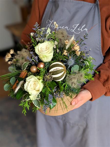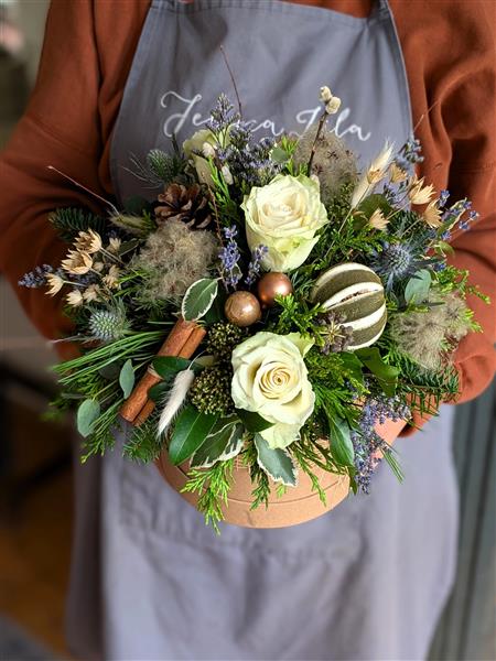 Introducing the 'Scandi Christmas' hatbox. This enchanting design captures the essence of sophisticated, natural Nordic décor with fragrant, deep green evergreen foliage and crisp winter white roses, evoking a serene, snowy landscape. The arrangement is finished with a touch of seasonal sparkle, including shimmering copper and bronze baubles. It features natural, rustic elements like pine cones, aromatic cinnamon sticks, and soft, fluffy seed heads, beautifully contrasted with delicate lilac limonium and striking blue thistle.