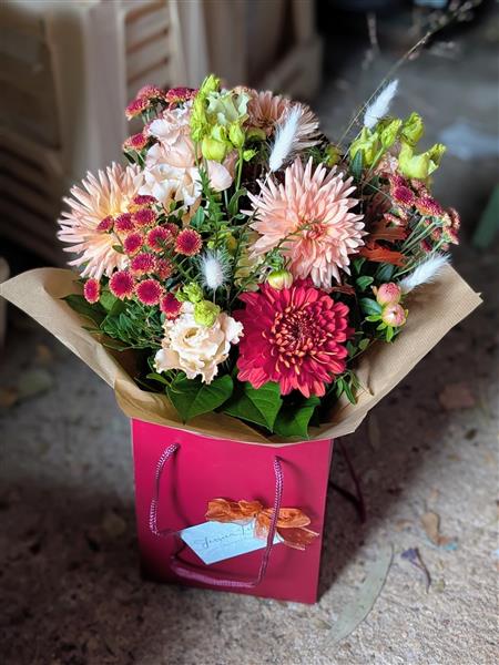 Hand-tied bouquet delivered in bubble of water, gift wrapped and presented in a bag