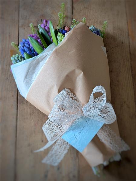 Welcome to my 'Simply Wrapped' range - single stems of beautiful mixed English hyacinths with a touch of thlasspi foliage, bunched together and wrapped simply and beautifully in brown paper and tissue, finished with a bow. 🪻