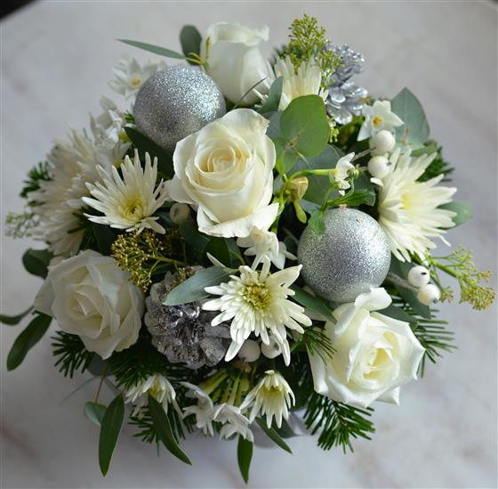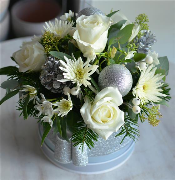 A beautiful posy of white roses, the 'Snow Queen' hatbox combines these with a mix of lisianthus and seasonal foliage including blue spruce and eucalyptus. All finished with frosted white berries and touches of white filler flowers with silver accents.